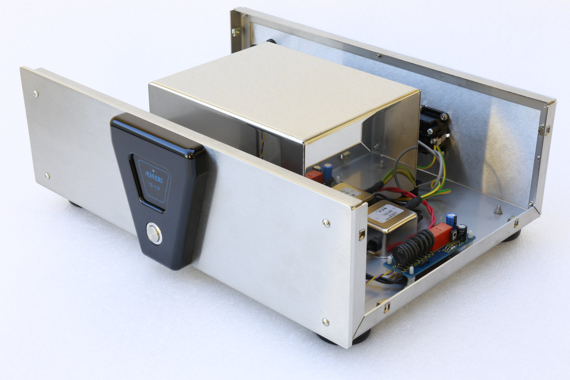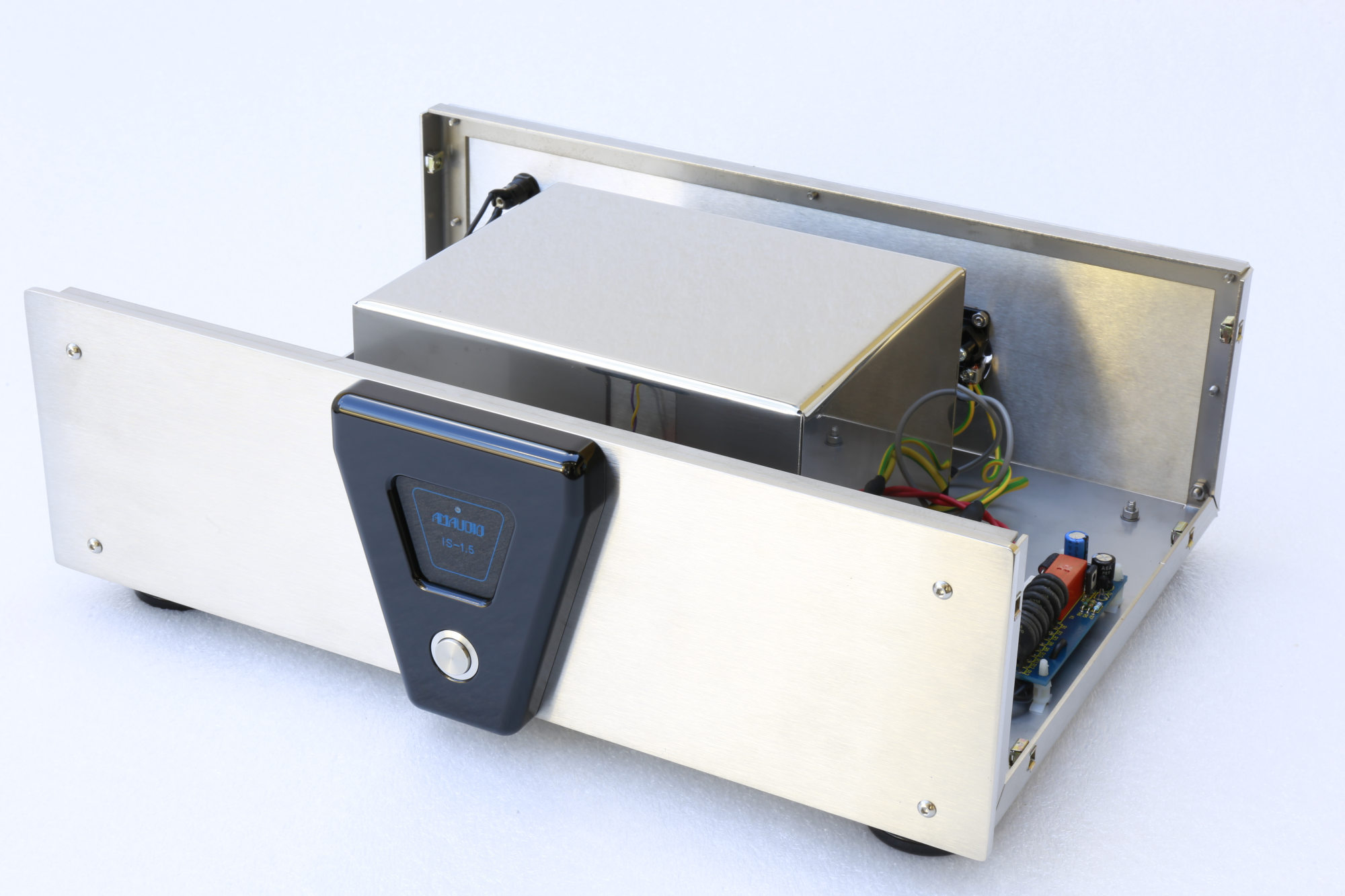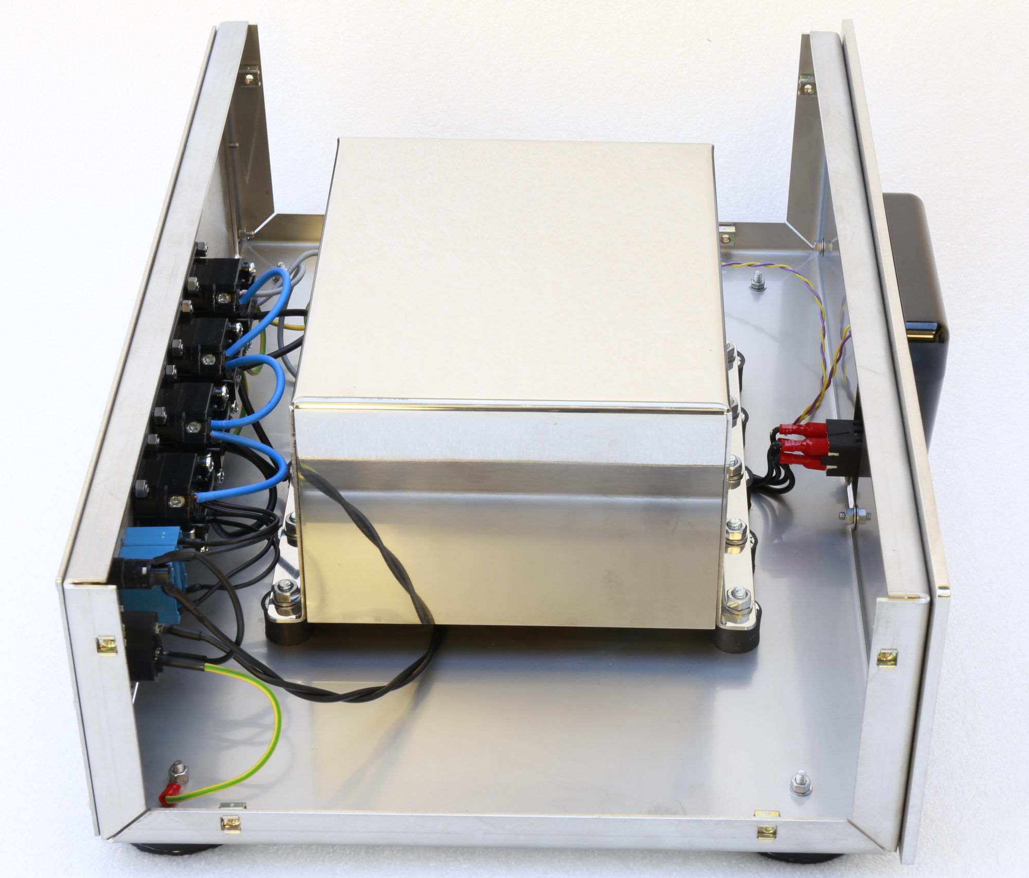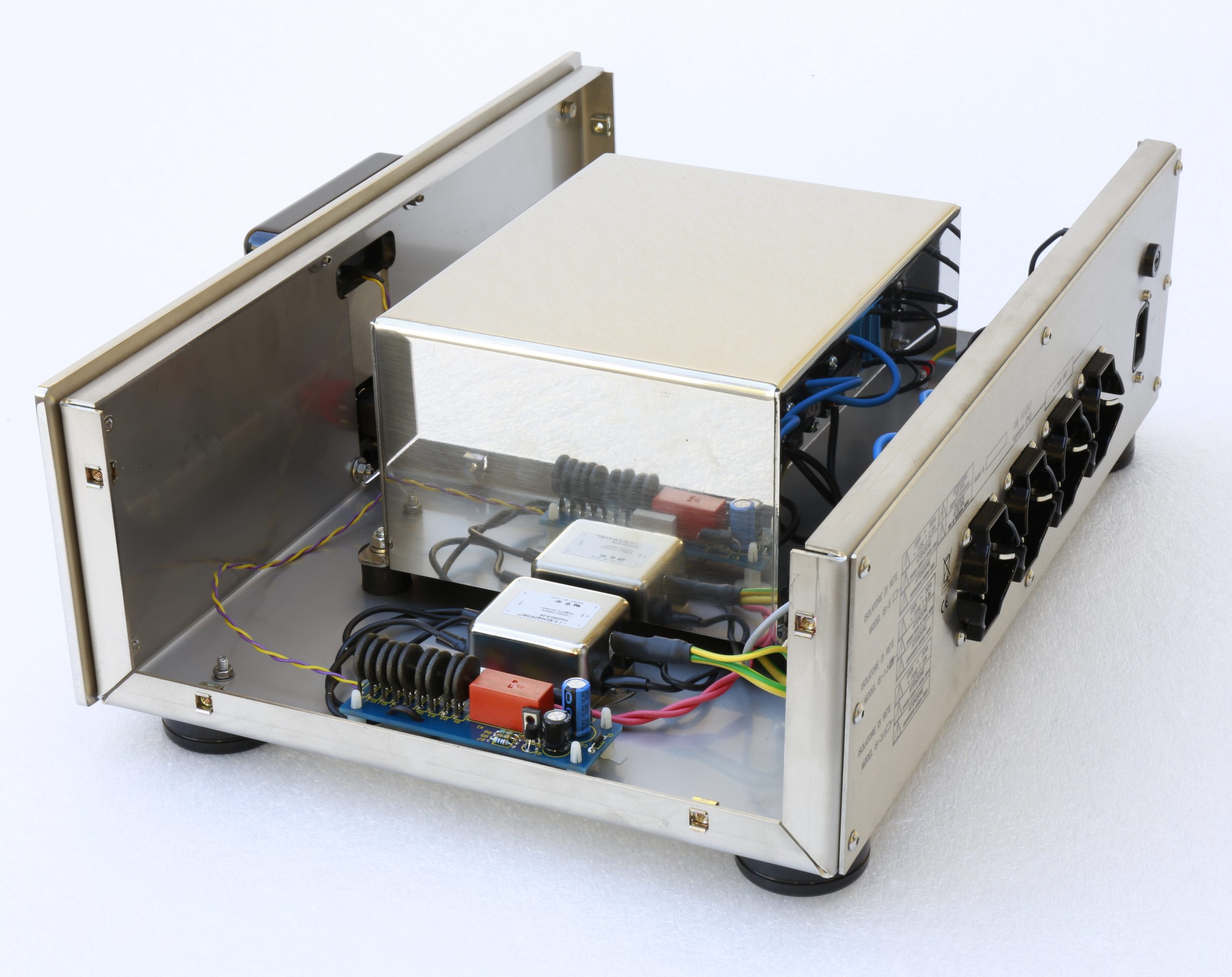 Il flusso magnetizzante del nucleo è stato volutamente tenuto estremamente basso sia per avere la minore dispersione magnetica possibile sia per evitare la distorsione della forma d’onda presente con elevato flusso magnetico. In più attorno al trasformatore è stato posto uno schermo in rame per raccogliere e annullare le dispersioni elettromagnetiche degli avvolgimenti, che sono un effetto collaterale della particolare geometria di realizzazione e che quindi devono essere trattate all’origine. Non solo: il trasformatore è poi stato inserito in un contenitore in acciaio e affogato in una colata di resina specifica, ottenendo una seconda efficace schermatura verso le perdite elettriche e magnetiche oltre che blocco totale di qualsiasi rumore meccanico proveniente dal nucleo ferromagnetico e con il non certo secondario effetto di uniformare la temperatura di funzionamento del sistema. Il tutto è montato con supporti antivibranti nel bel contenitore metallico in acciaio inox che non ha solamente la funzione di sostegno meccanico ma anche di ulteriore schermatura bidirezionale.