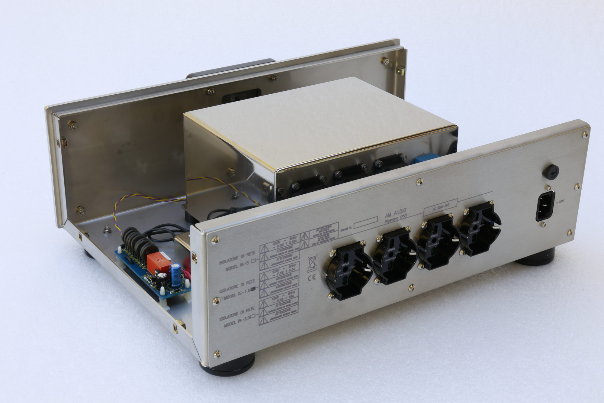 Poteva bastare questo? Per AM Audio certamente no. Difatti sull’ingresso di rete è comunque montato un bel filtro rete a doppia cella, non certo indispensabile ma molto utile in quanto pur essendo a bassa capacità il trasformatore di isolamento riduce la propria efficacia per i disturbi a frequenze sull’ordine dei MHz, quelle dove il filtro rete invece esibisce il meglio di sé, oltre a un sistema di condensatori MKP in uscita per ridurre l’impedenza e anche abbattere eventuali alte frequenze che possono essere immesse in rete da alcuni dei nostri utilizzatori, tipicamente lettori CD, streamer o altro dove al proprio interno ci sia qualcosa di digitale.